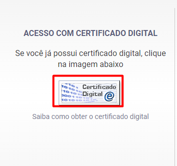 Faça o login informando o CNPJ da sua empresa e a senha de acesso, ou entre utilizando o Certificado Digital da empresa. Para acessar com certificado, selecione a opção indicada na imagem abaixo.