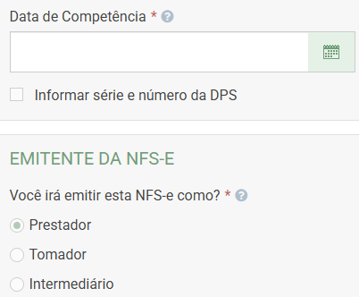 Informe a data em que está emitindo a nota no campo “Data de Competência” e selecione a opção “Prestador”.