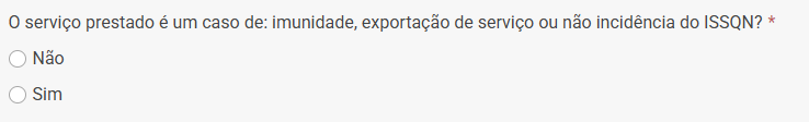 No campo “O serviço prestado é um caso de: exportação, imunidade ou não incidência do ISSQN?” Sendo um serviço no Brasil, selecione a opção "não" e caso atenda os critérios de exportação de serviço, você deverá marcar “sim” para ter direito às isenções de impostos.