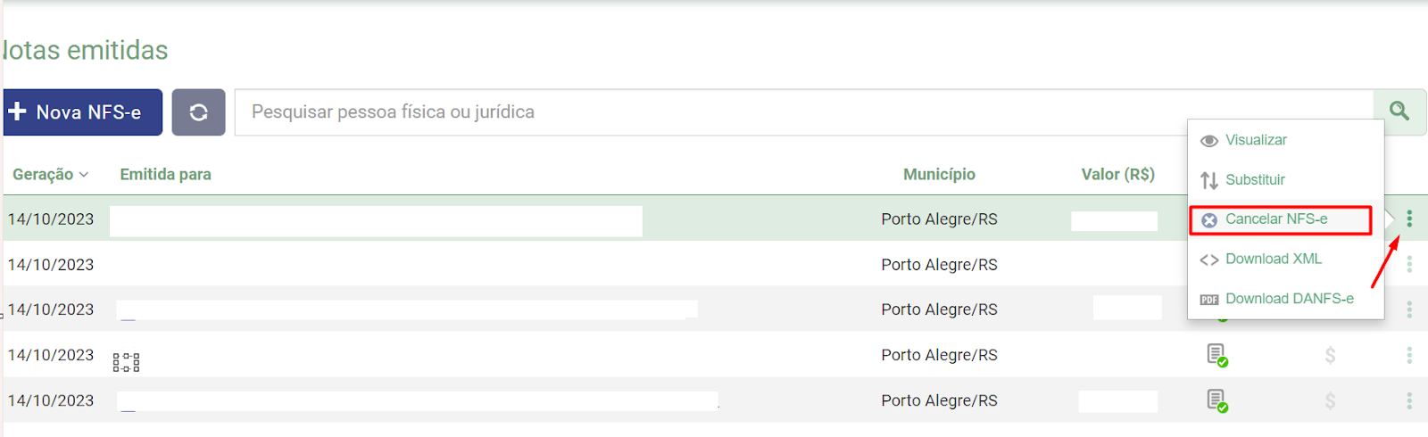 Basta clicar no ícone destacado na imagem abaixo e selecionar “Cancelar NFS-e”.