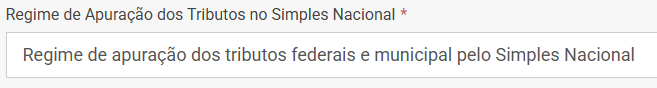 No campo “Regime de Apuração dos Tributos”, selecione a opção “Regime de apuração dos tributos federais e municipais pelo Simples Nacional”.