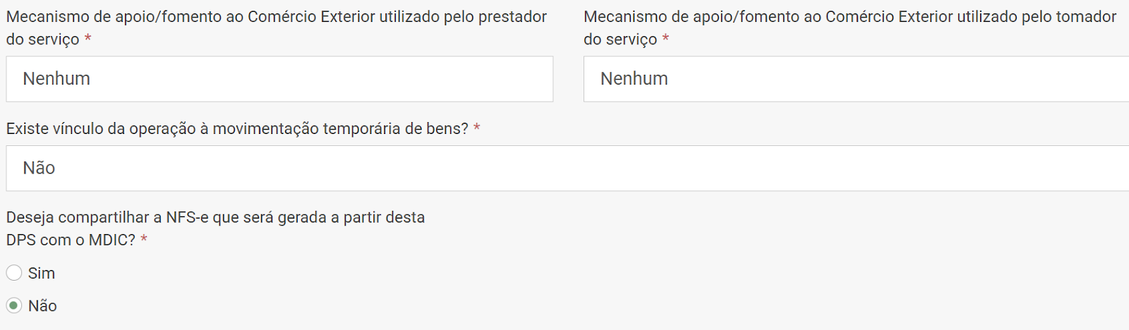- Mecanismo de apoio/fomento ao Comércio Exterior (prestador): selecione “Nenhum”.