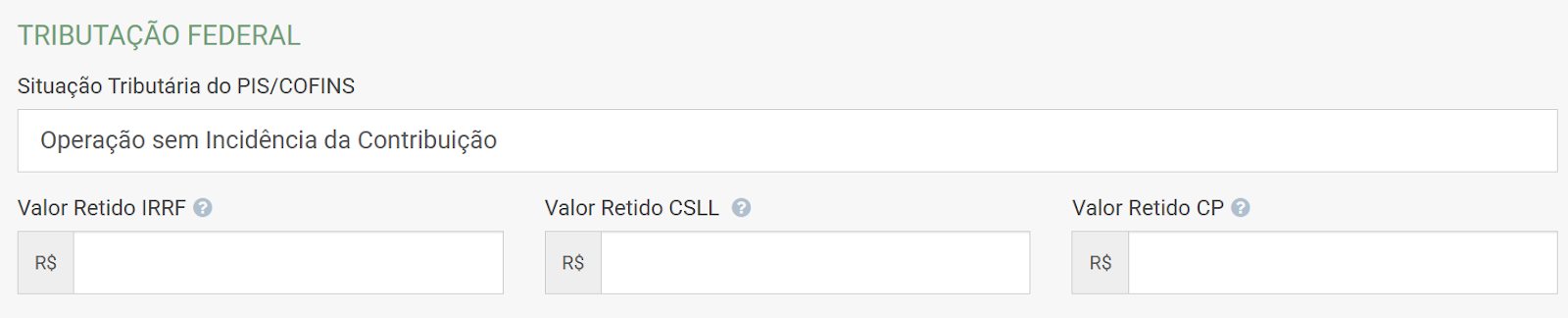 8. No campo de tributação federal, selecione a opção “Operação Tributável com alíquota básica” e informe os impostos a serem retidos pelo tomador (PIS, Cofins, IRRF e CSLL).