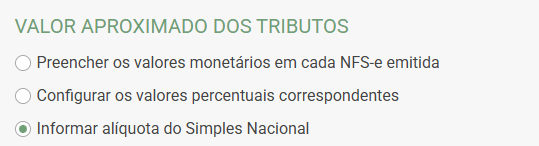 No campo “Valor Aproximado dos Tributos”, selecione a opção “Informar alíquota do Simples Nacional”.