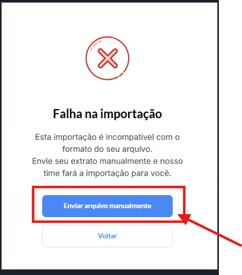 4. Se o extrato não for compatível, será apresentado a mensagem de erro conforme tela abaixo e você deverá realizar o envio para importação manual. Para isso clique em “Enviar arquivo manualmente”
