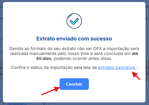 6. Após o envio, será apresentada a tela abaixo, clicar em “Concluir” . A partir do envio, nossa equipe de contadores realizará a importação manualmente na plataforma.