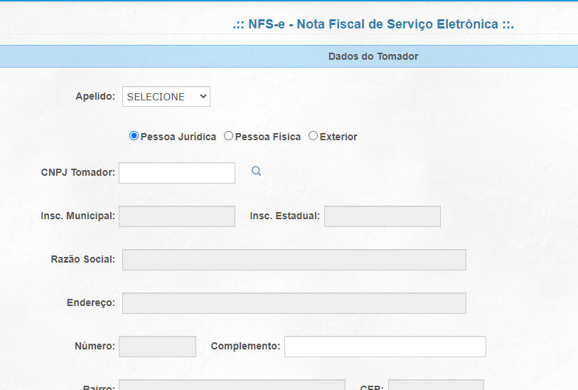 6. Nesta etapa você irá informar quem te contratou (tomador). Se for uma empresa do exterior que não possui CNPJ que te contratou, você deve selecionar a opção "Exterior", na sequência preencha todos os campos conforme os dados do seu tomador.