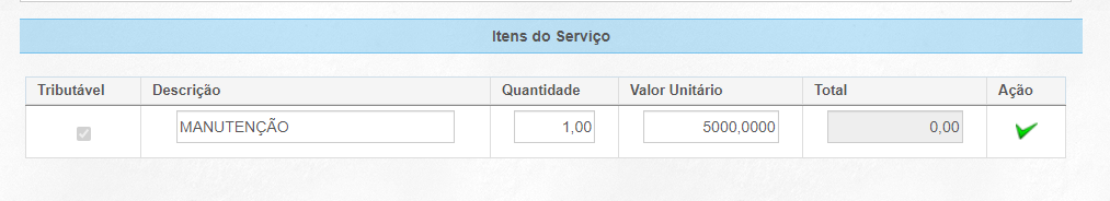 5. Em "Itens de Serviço" escreva uma palavra-chave para o serviço que você prestou, por exemplo, se fez a manutenção de uma página eletrônica, escreva "manutenção", em seguida informe o valor que cobrou pelo serviço, por fim, clique no ícone verde na coluna "Ação". Se prestou mais de um tipo de serviço, você poderá incluir nesta etapa.