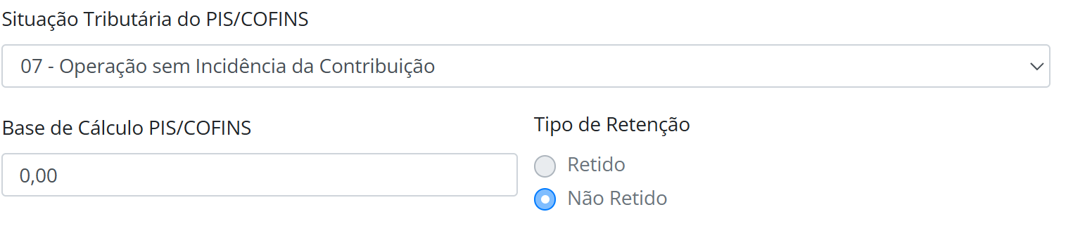 No campo Tributação PIS/COFINS, selecione Nenhum.