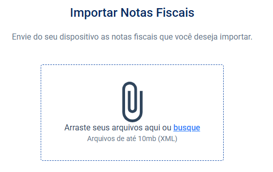 Clique em ‘continuar’ e depois busque ou arraste o arquivo com as notas fiscais que deseja importar ou arraste para dentro do painel de importação.
